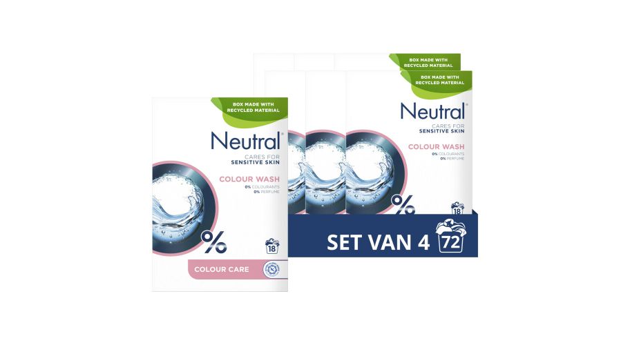 Neutral Waspoeder Color in een verpakking van 4 x 18 scoops (4 x 1,04 kg) is speciaal ontwikkeld voor het wassen van gekleurde kleding. Dit waspoeder is parfumvrij en hypoallergeen, waardoor het ideaal is voor mensen met een gevoelige huid of allergieën. De formule verwijdert effectief vlekken en houdt de kleuren van je kleding langer stralend.