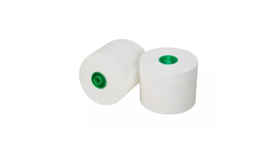 Met 869 vellen per rol biedt dit toiletpapier voldoende voorraad voor langere periodes, waardoor het perfect is voor gebruik in kantoren, horeca en andere commerciële instellingen. Het ontwerp van het toiletpapier is gericht op gebruiksgemak en hygiëne, met een dop die helpt om de rol op de juiste manier te plaatsen in de dispenser. Dit zorgt voor een eenvoudige en efficiënte manier van gebruik, wat bijdraagt aan een schone en georganiseerde sanitaire omgeving.
